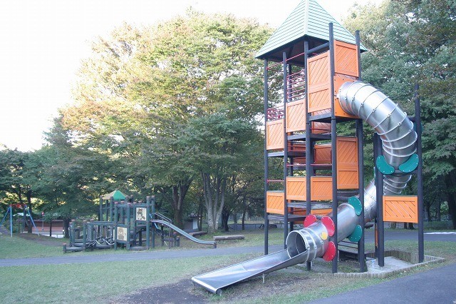 広い芝生広場とアスレチック遊具あり。 |