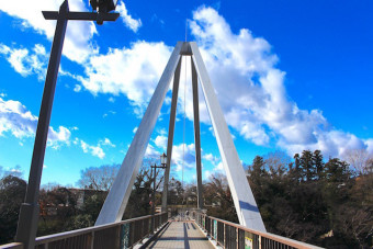 青空に映える真っ赤な「高津戸橋」 |