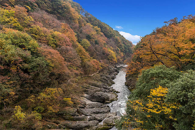 四季折々の自然が満喫できる景勝地群馬県、みどり市の観光スポット「高津戸峡(たかつどきょう)」は、関東の耶馬溪(やばけい)とも称される絶景ポイントです。真っ青な渡良瀬川を挟むようにそびえる渓谷には春夏秋冬それぞれの顔があり、特に秋は川岸から迫るような紅葉が楽しめるスポットになっています。また、わたらせ渓谷線大間々駅から徒歩約5分とアクセスしやすいのも特徴です。 |