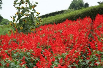愛宕山の小高い丘の上の公園愛宕神社のある愛宕山(標高283m)の小高い丘に作られた公園の東側斜面からは真壁調整池(ダム湖)が一望でき、さらに斜面の花壇に植えられた四季折々の花が季節を楽しませてくれる。公園内には芝生が植えられ、シートを広げたり、ベンチでくつろいだりとのんびり過ごす人の姿も。水車小屋から流れた水が日本庭園へと流れ込むゾーンは水辺と日影があり、暑い日でも過ごしやすい。 |