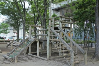 アスレチック遊具がたくさん公園を囲むように木立が植えられ、この下にたくさんの種類の遊具が並ぶ。強い日差しも木立が程良い日陰をつくってくれ、快適に遊ぶことができそう。小さい子なら複合遊具やすべり台、小学生からのわんぱくっ子には、丸太やネットやロープなどのアスレチック遊具がおすすめ。 |