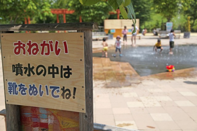 4月から10月頃まで遊べる大人気の噴水広場。数十分間隔で100箇所以上ある足元の穴から水が変則的に噴き出します。ずぶ濡れになるので水着と着替えの用意を。 |