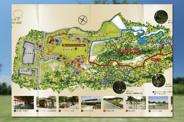 | 休憩所、常駐サービスセンター、クラフト工房、噴水広場、健康歩道、芝生広場、バーベキュー広場、炊事場、スポ・レク広場、花壇、里山遊歩道、パーゴラ、ベンチ、AED | ふわふわドーム、ブランコ、大小すべり台、ネットクライム(ハンモック遊具)、木製ロッキング遊具、子供用補助輪付き自転車(貸出)、フラフープなど遊具(貸出) | |||||