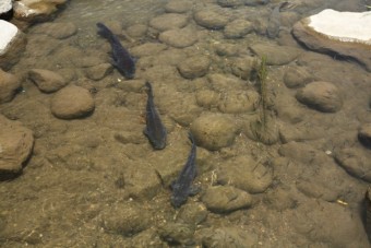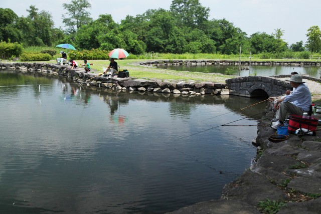 ゲートボール場から無料の釣り池までシーズンには鮎釣りでにぎわう碓氷川の南側、川に沿って東西に長い緑地内には、広い駐車場や広いゲートボール場(多目的広場)、無料の釣り池まである。釣り池には連日釣りを楽しむ人たちの姿。上流の碓氷川水門から引いた水が流れる緑地内の小川では、ザリガニや小魚を夢中になって捕る子供たちの姿が。 |