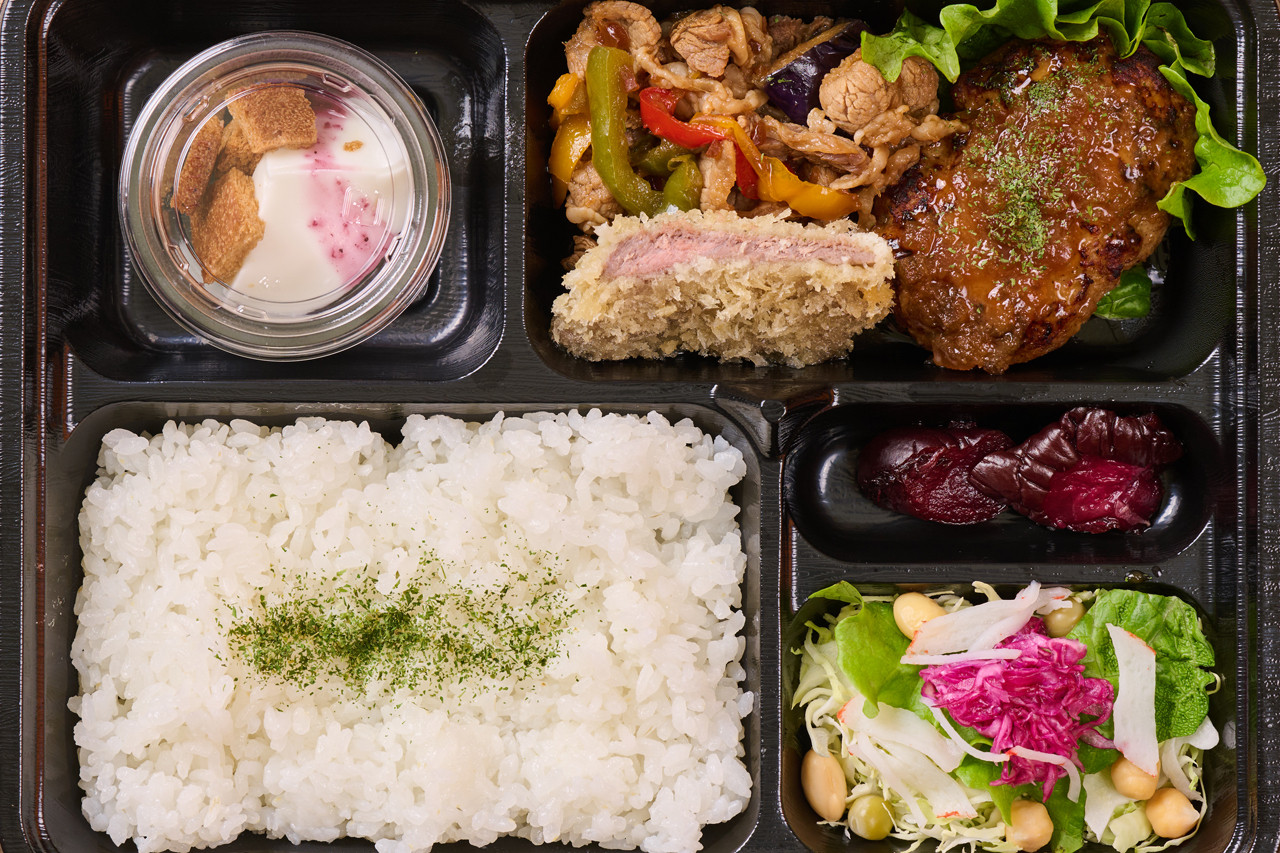 主役は上州牛を使った手ごねハンバーグ。小ぶりながら、肉の旨みがぎゅっと詰まった満足感のある一品です。さらに上州牛焼肉と牛カツも添え、牛の美味しさを三通りで楽しめる贅沢な内容。彩り豊かな副菜とともに、最後まで飽きずに味わえる“大人のご褒美弁当”です。