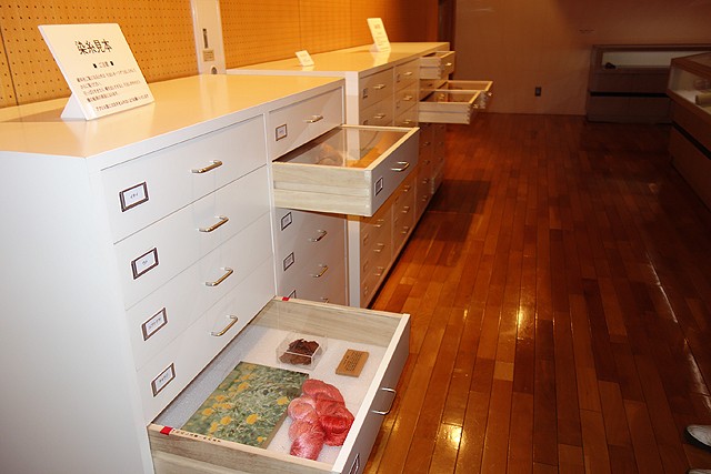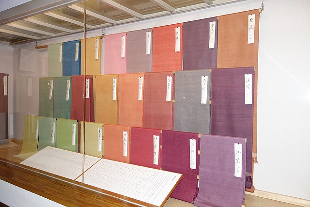草木染で再現された冠位12階の服飾や延喜式による王朝の彩色、昔から愛された伝統の色彩の世界を紹介する常設展示がございます。また、年2回程度当園独自の企画展を開催しています。染色糸には、解説染料標本が添えられ、媒染剤による色の違いも見ることができます。