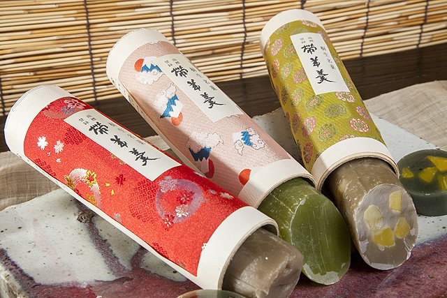 桐生の老舗和菓子店桐生の本町に本店を構えて90年。東京は浅草で芋問屋を営んでいた初代定吉によって「舟定(ふなさだ)」ののれんを揚げ、定吉はこの芋を使って舟定名物「芋ようかん」を世に送り出しました。どこか懐かしくホクホクとした芋本来の素朴な味は舟定代々の当主が受け継いだ伝統の味です。 また、舟定の銘菓である「帯羊羹」は直火で窯を炊く昔ながらの製法で、焦げを出すことによってコクと深みを増します。栗・小倉・抹茶の3種類で、桐生で織られた金襴が約70~80種類が巻かれております。どの柄にしようか悩むのも帯ようかんの楽しみでもあります。 |