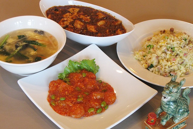 | 【2人前】5060円 【3人前】7590円 【4人前】10120円 主菜 (以下より1品お選び下さい) ・豚肉とピーマン炒め ・海老のチリソース煮込み ・酢豚(もち豚使用) ・鶏のカシューナッツ炒め 四川麻婆豆腐 玉子スープ チャーハン、又はソース焼そば プラス 660円 でデザート付(デザート3点盛り※アイスクリームorシャーベットは選べます) |
