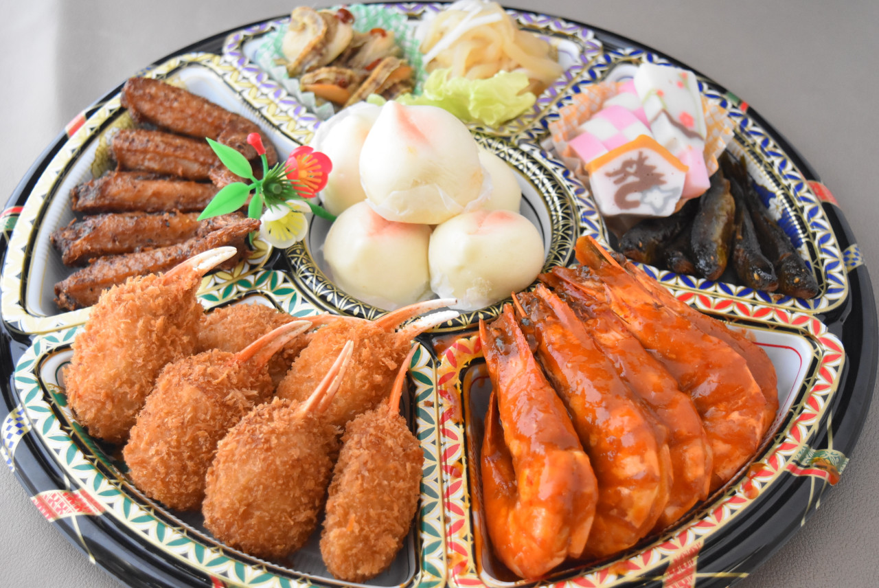 | 器の大きさは直径約36cm ①有頭エビのチリソース ②カニ爪のフライ ③手羽黒胡椒あげ ④鮎の甘露煮 ⑤ホタテの辛味煮 ⑥羽子板カマ ⑦桃ちゃんまんじゅう ⑧クラゲの大根甘酢 |
