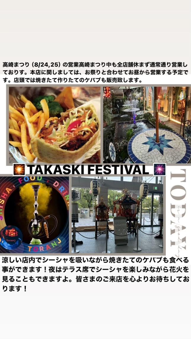 高崎まつり(8/24,25)の営業高崎まつり中も全店舗休まず通常通り営業しております。本店に関しましては、お祭りと合わせてお昼から営業する予定です。店頭では焼きたて作りたてのケバブも販売致します。涼しい店内でシーシャを吸いながら焼きたてのケバブも食べる事ができます!夜はテラス席でシーシャを楽しみながら花火を見ることもできますよ。皆さまのご来店を心よりお待ちしております!