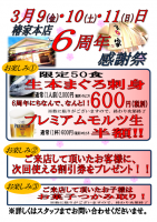 毎度ご来店頂きまして誠にありがとうございます。 皆様のおがげをもちまして3月11日で6周年を迎える事ができます。 日頃の感謝の意を込めまして本日より、3月9(金)・10(土)・11(...