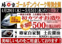 毎度ご来店いただきまして誠にありがとうございます。 椿家では4月29日(木)~5月5日(水)のゴールデンウイーク7日間限定で、 【初カツオお造り】を1人前 通常1,000円のところ、...