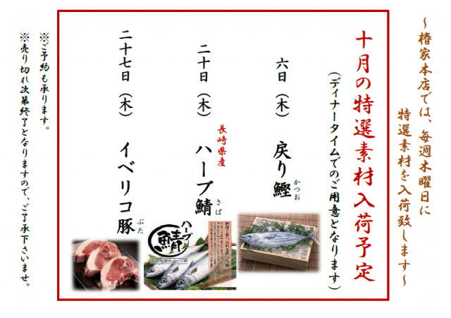 椿家本店では、毎週木曜日に特選素材を入荷致します。