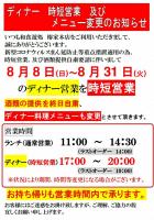 ディナータイム(時短営業)・・・17:00~20:00(ラストオーダー 19:00