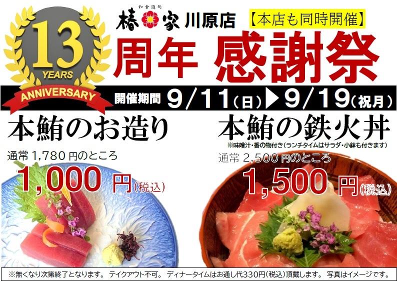 皆様のおかげをもちまして、姉妹店の椿家川原店は9月11日で13周年となります!