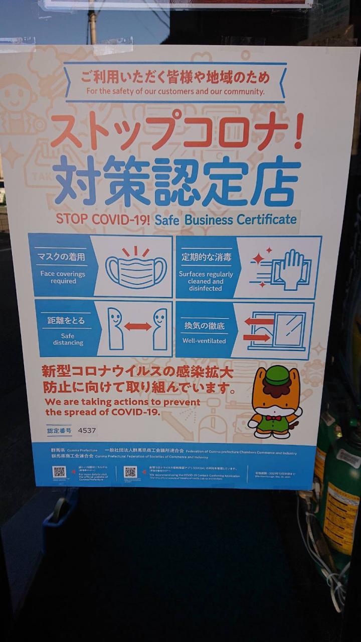 群馬県の感染症予防対策認定証承認され、拡散防止対策に取り組んでおりますので、ご利用の際の参考にして下さい。