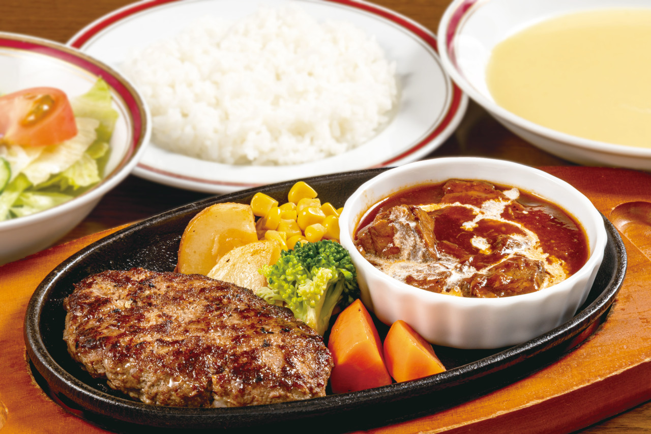 牛ハンバーグ&ポーク煮チーズ焼   牛ハンバーグ&ビーフシチュー   山ステーキ&有頭エビフライ