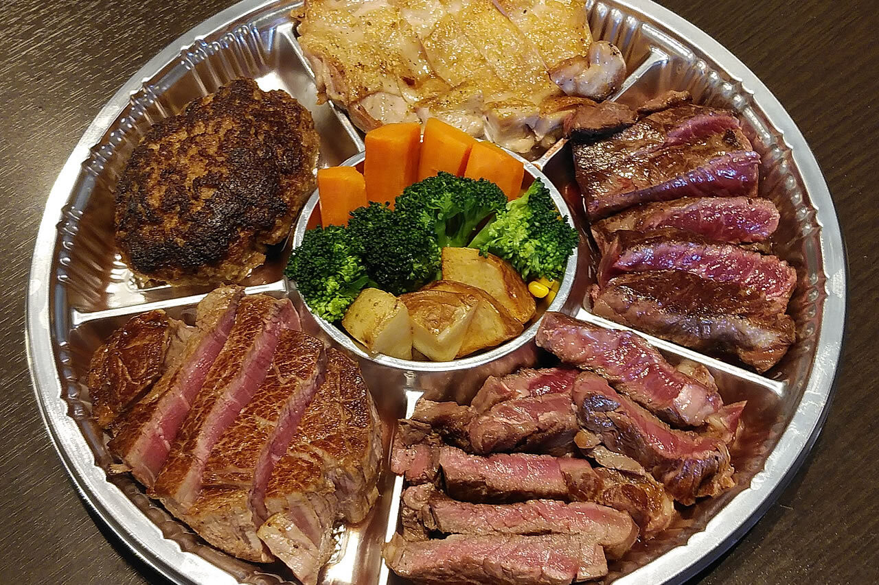 山ステーキ、リブロースステーキ、ヒレステーキ、牛ハンバーグ、赤城鶏ステーキ (タレ付き)