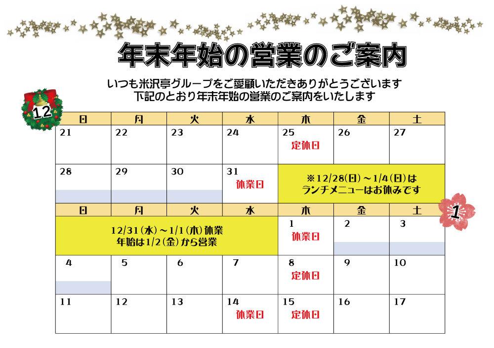 2025年も残すところわずかとなりました。年末年始に帰省するご家族やお友達とのご来店を従業員一同お待ちしております。営業日・営業時間は店頭でもご案内していますのでご確認ください。2026年も米沢亭グループをよろしくお願いします。