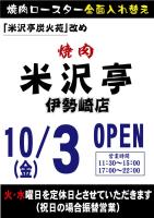 いつも米沢亭グループをご利用いただきありがとうございます。ながらく休業しておりました伊勢崎店ですが営業を再開させていただく運びとなりました。リニューアルオープンにあたり煙の少ないロースターに全面入替を行...